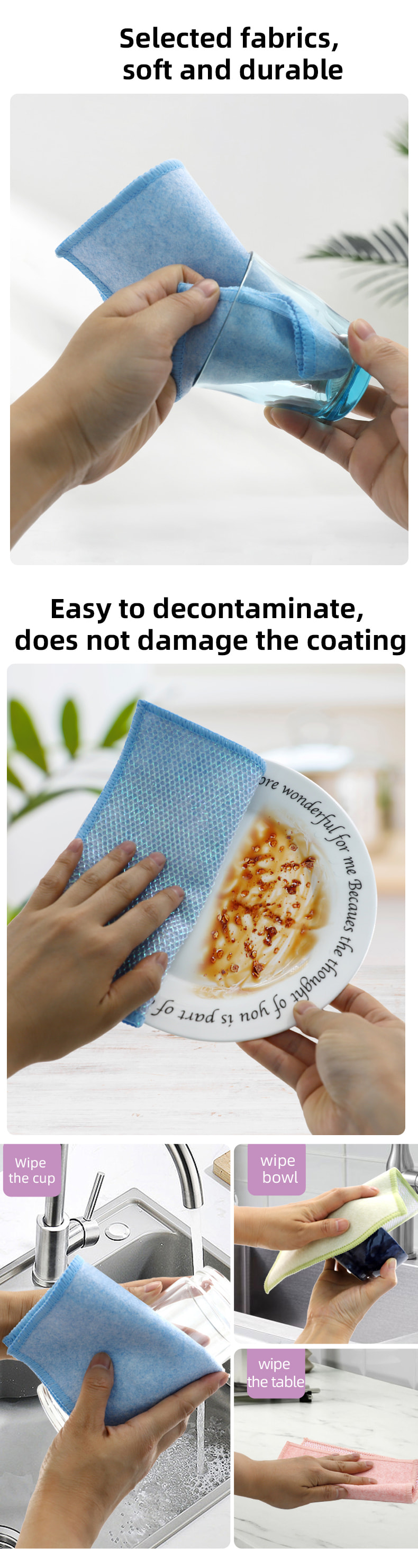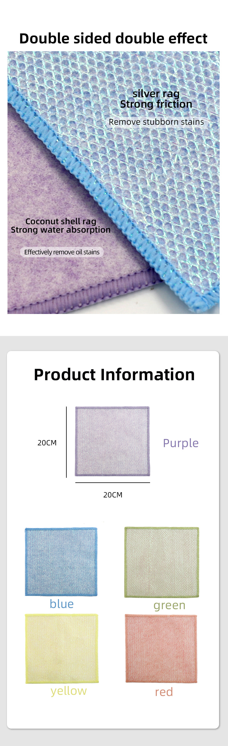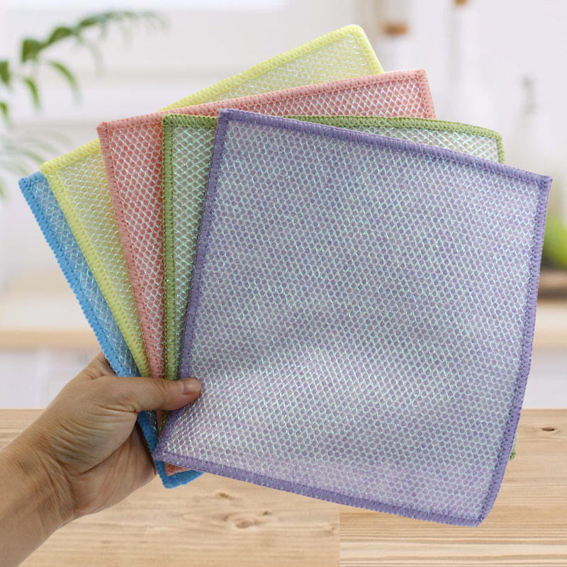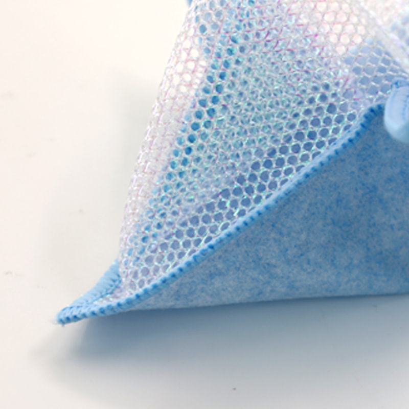 形状特殊,色彩鲜艳,外观高大;一面为色彩鲜艳的清洁布,具有很强的刮擦能力,另一面为网布,兼具刮擦清洁的双重功能;无油,吸水性强。一面植入各种图案的彩色丝绸,另一面为无油吸水的粘胶布表面, 它很漂亮,可以满足擦洗和一侧擦洗的双重功能。